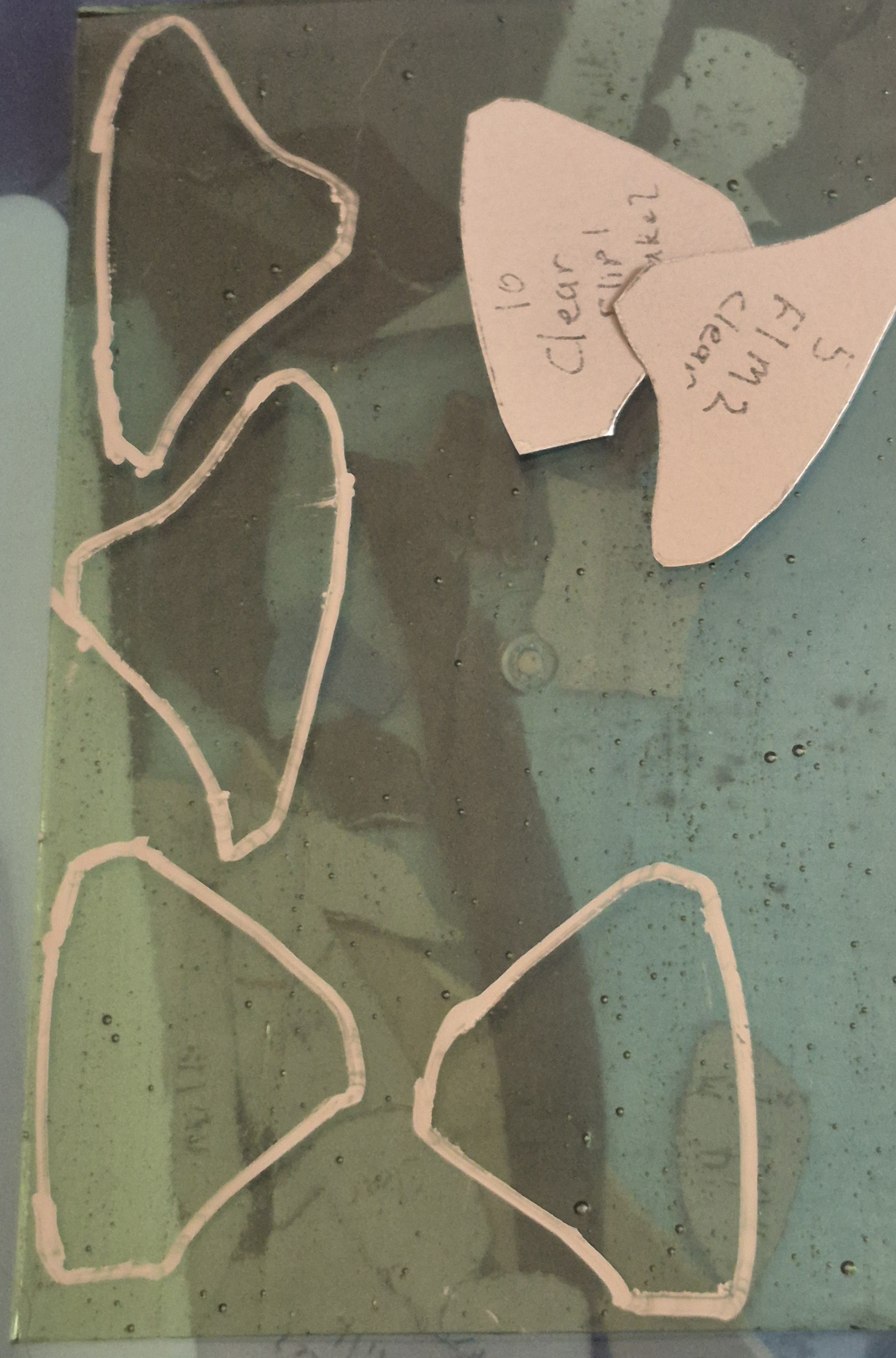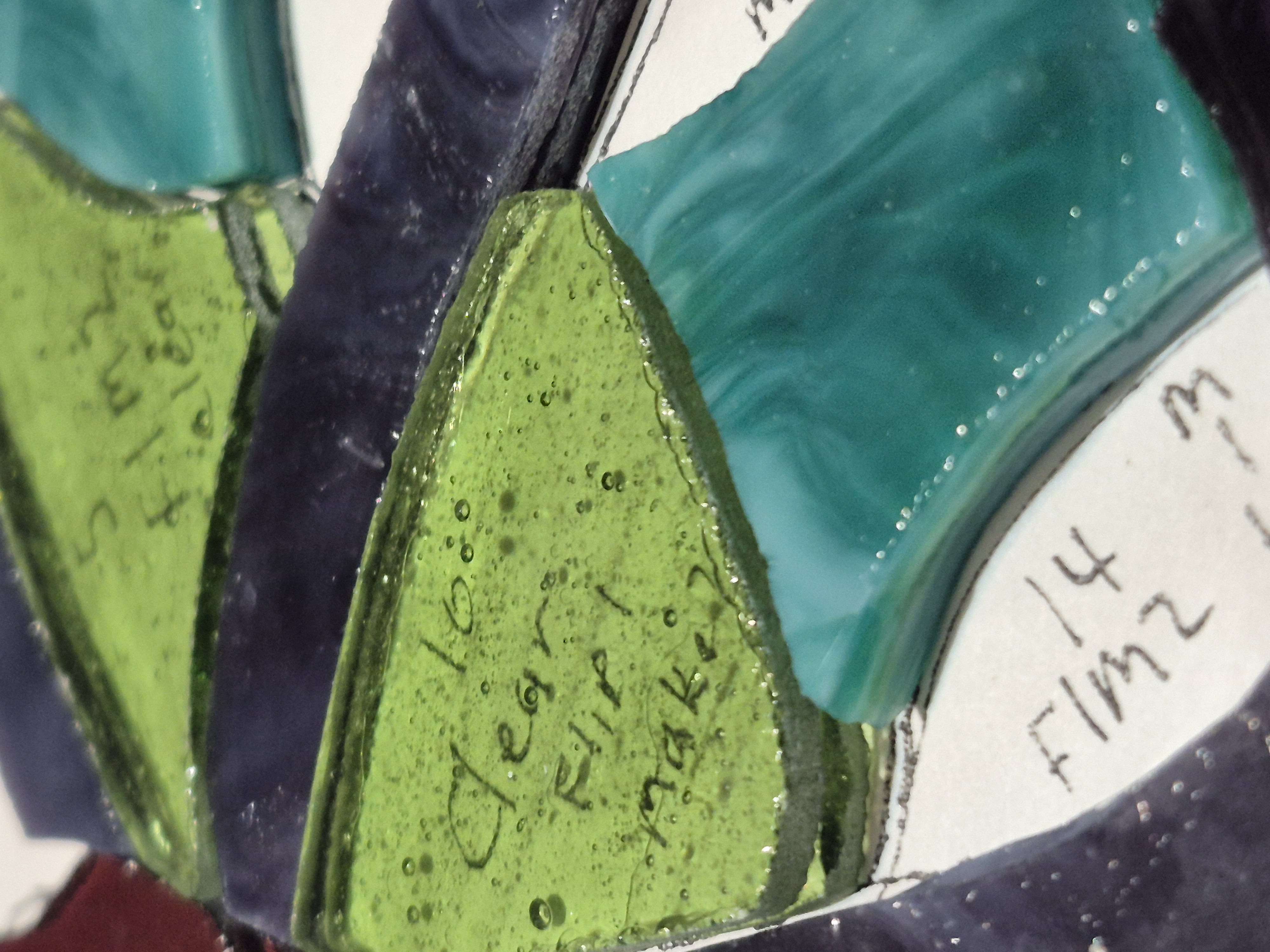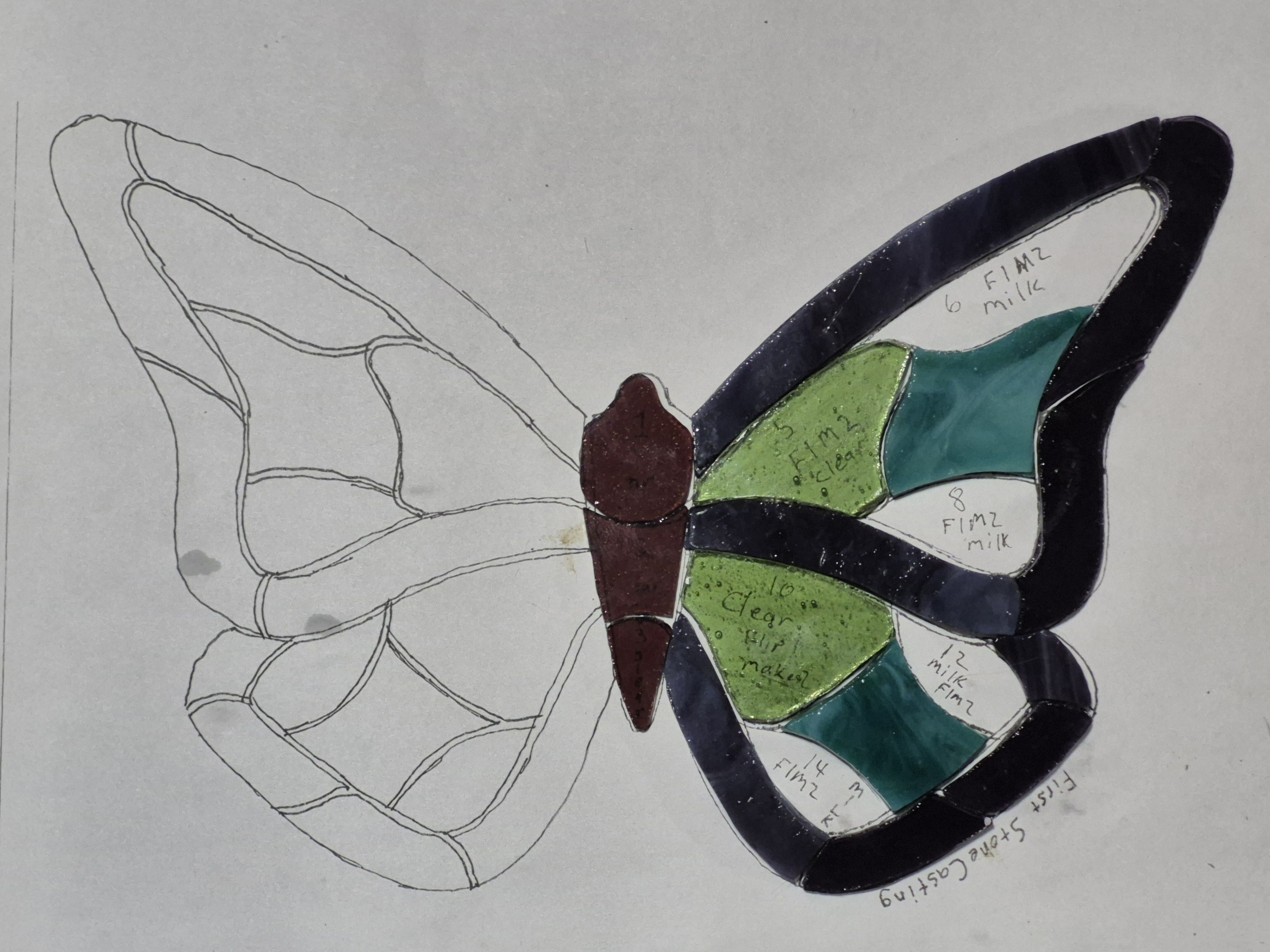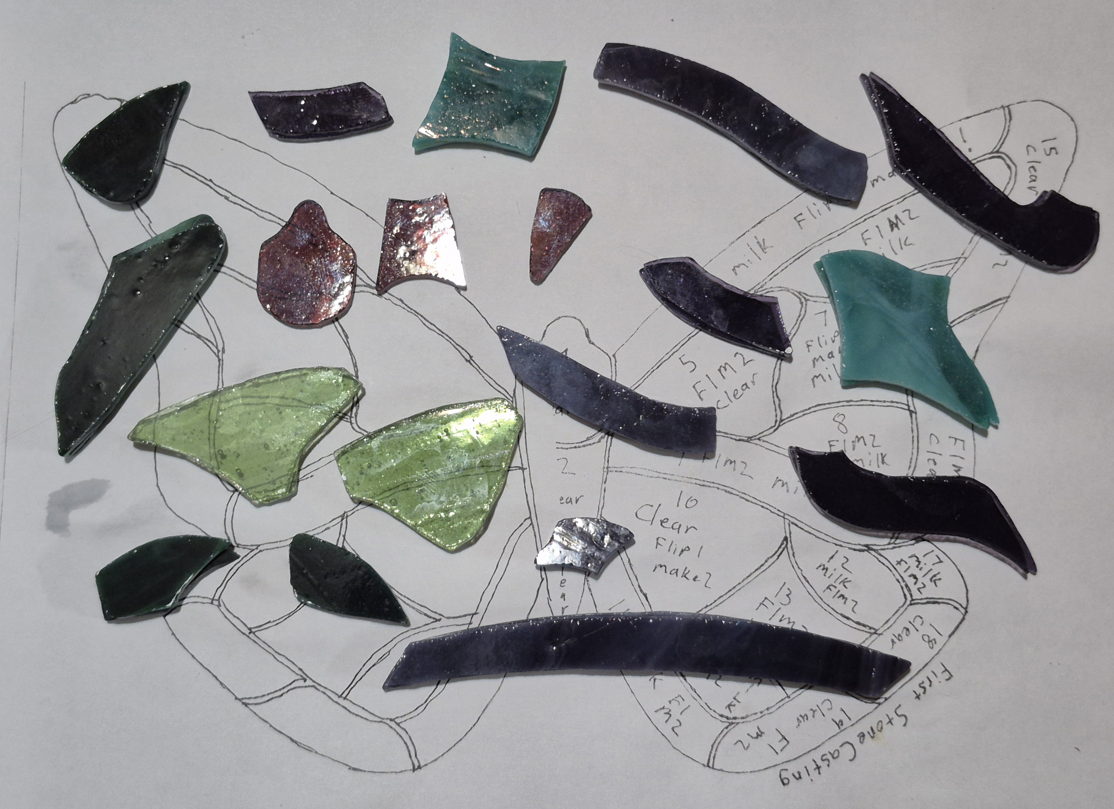 Look for places that'll need a bit of space and get that all marked out. This comes from experience, but the rough glass shouldn't be too tight. Allow space for the foil/came and give some wiggle room. On this piece, not so important, but if you need a panel to fit a specific space....just make sure the final part doesn't "grow" over spec.